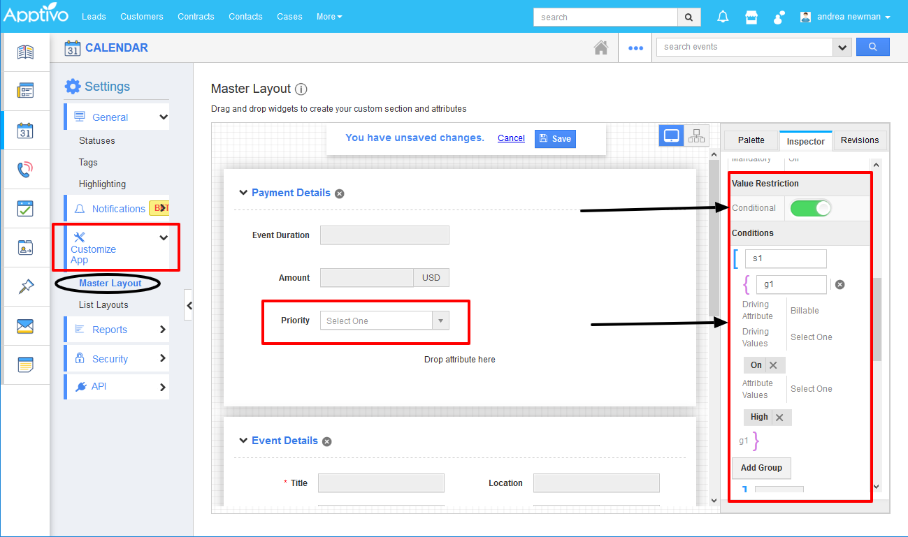 For instance: Consider the Events. Go to Settings -> Customize App -> Master Layout. Click on Priority field and enable the Conditional toggle ON under Value Restriction section from the Inspector tab and specify the condition.