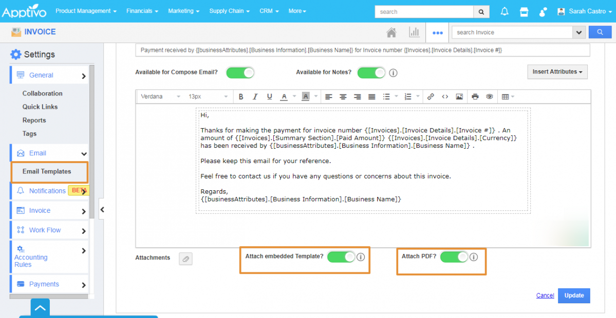The Finance department of an organization is of utmost importance as it plays a major role in revenue management. The primary applications in the finance category of Apptivo are used to generate Invoices, Estimates, and/or Work Orders and send them as an email to the customers. Now, while sending an email, you can disable the email-embedded templates and instead, you can just attach the Invoice, Estimate, or Work Order as a PDF.