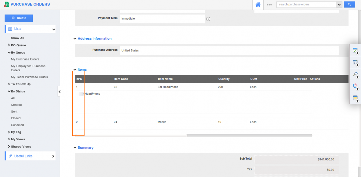 The Row-level Preview option for the line level sections is now implemented in Apptivo. Once the preview option is accessed, you can view and edit the line level attributes in the side panel pop-up.