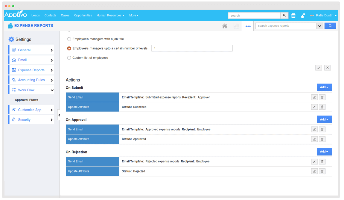 The expense reimbursement process doesn’t usually end with two people. The submitted report might go through various levels of approval. When the manager or finance team has piles of papers on their desks that they need to verify, the process can be slow and cumbersome. With automation in Apptivo, you could define a set of policies and system will automatically approve/disapprove expenses instantly and can save time.