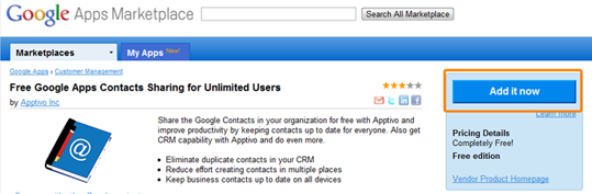 1.Go to the Apptivo Contacts Sharing App in the Google Apps Marketplace and click on “Add it now