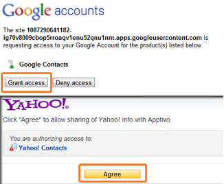 3.Depending on which type of import you selected, Google and Yahoo will ask you to grant them access to your contacts. You will then select which contacts you want added to Apptivo.